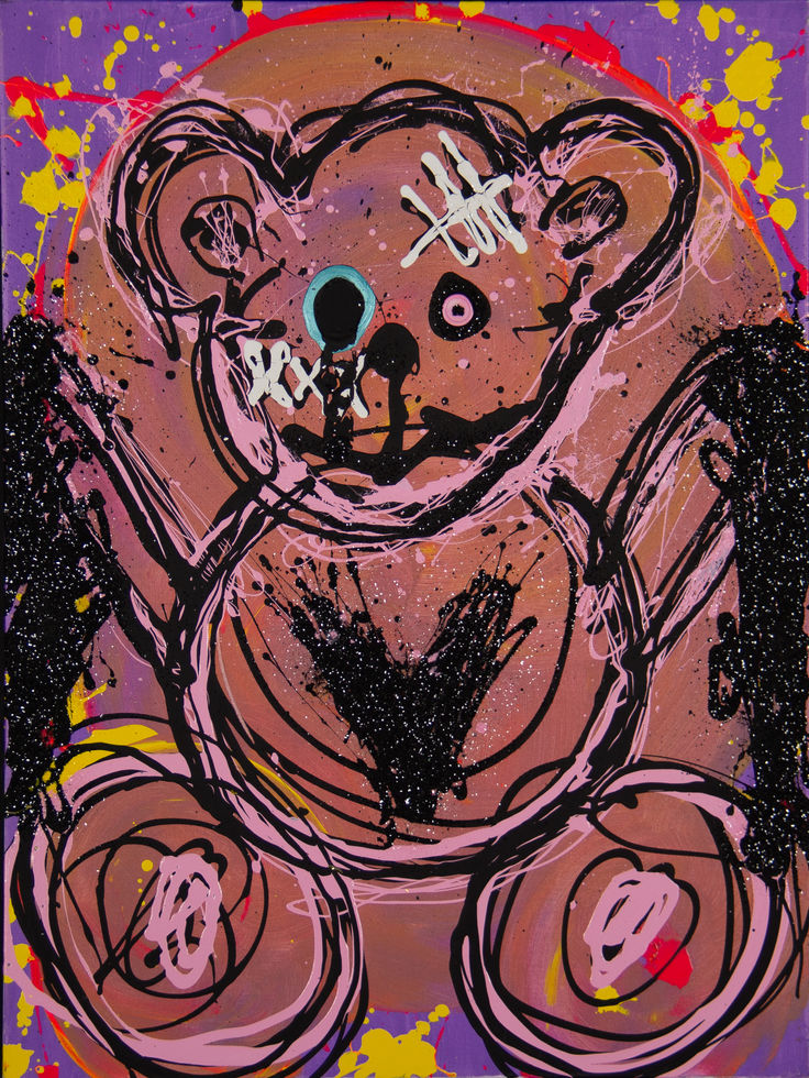 Part of the NEW Bear(ly) There collection, 113BR is one of the latest additions by our featured artist, exploring the raw tension between power and fragility. This striking new series captures the heart-wrenching imagery of bears tearing their hearts out, using fluorescent paints, broken acrylics, and diamond dust materials to create a visually dynamic and emotionally charged piece. The colors come alive when exposed to black light, offering an interactive experience that resonates with emotional exposure. This collection showcases the artist's unique vision and aligns perfectly with Jared's mission to provide modern, transformative art.